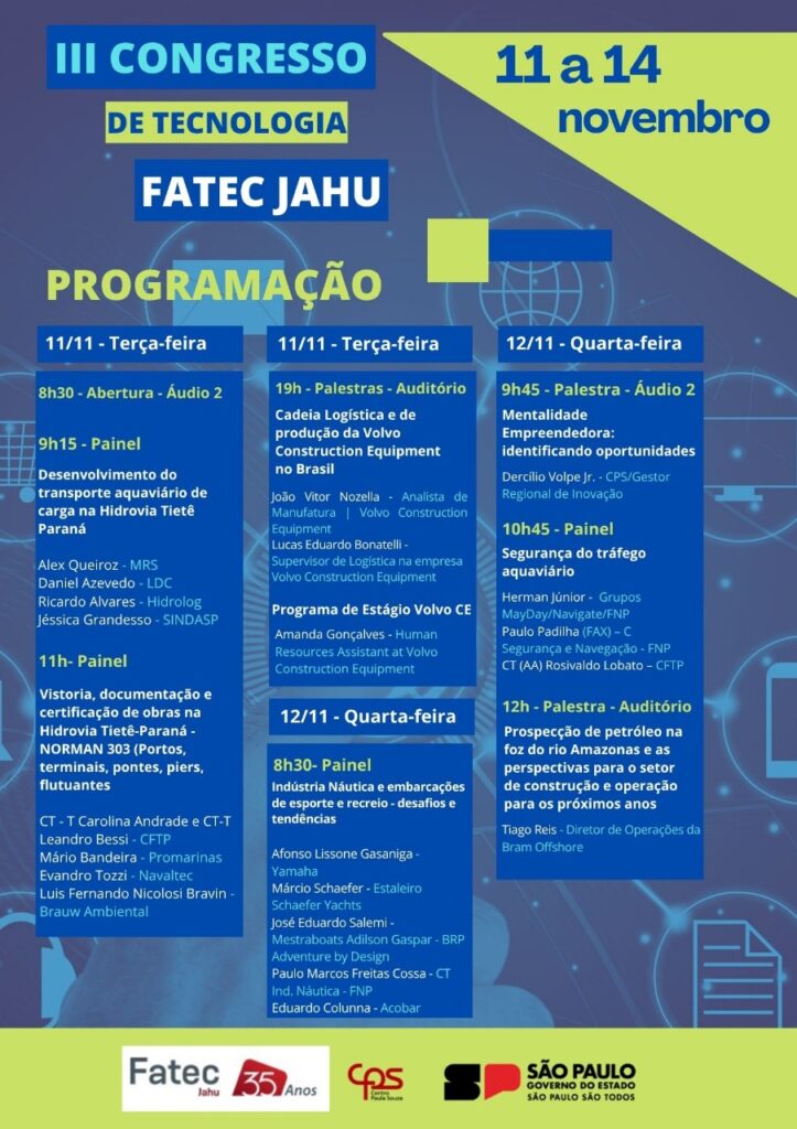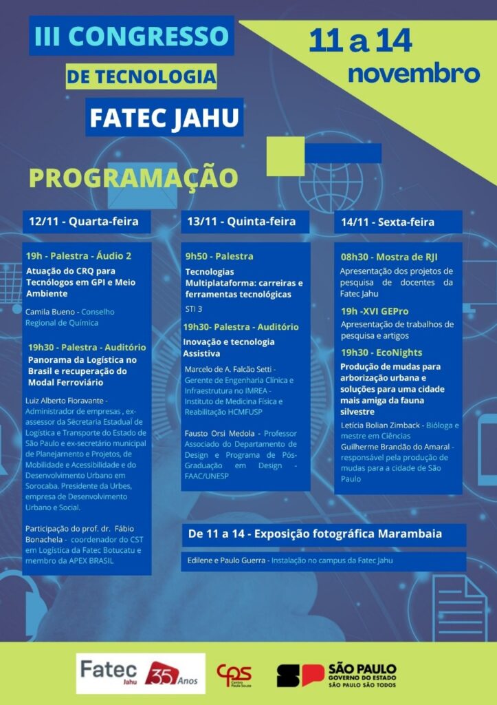 Acontece entre 11 e 14 de novembro o III Congresso de Tecnologia da Fatec Jahu, com painéis, palestras, mostra de trabalhos de pesquisa de docentes e de alunos e alunas. O evento vai reunir uma programação que oferece um cenário amplo para pesquisadores e profissionais de diversas áreas.